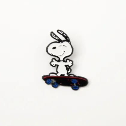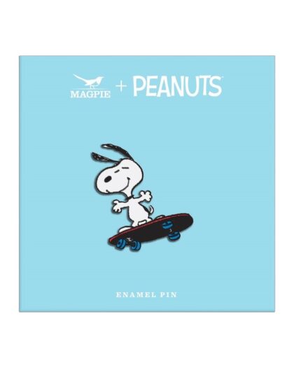 Officially licensed Magpie + Peanuts enamel pin featuring Snoopy on a skateboard. A fun, colourful, and collectible accessory for fans & pin collectors.