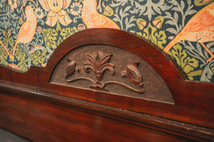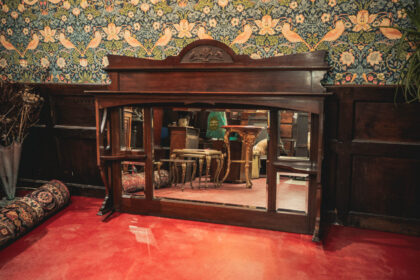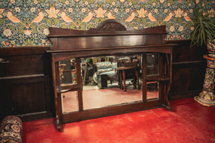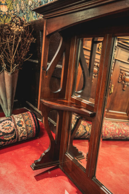 Large Edwardian over mantle mirror, Art Nouveau in style and good dark mahogany in colour. A good piece for a dining room or formal style living room. also good for a bar or restaurant.
