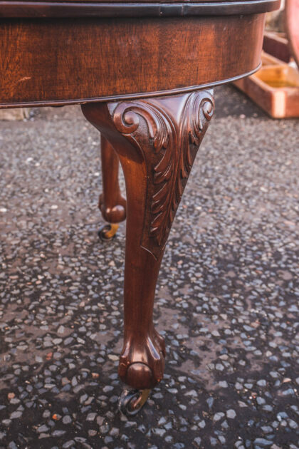 Victorian-style reproduction mahogany extending dining table with carved ball and claw feet.