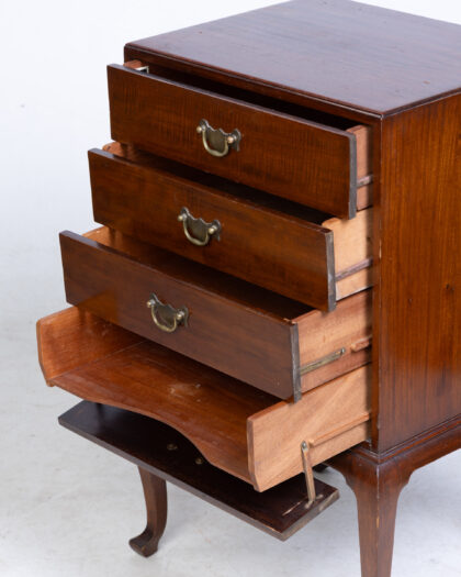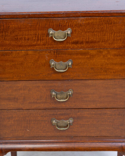 Mahogany sheet music cabinet with brass handles. Four drawers and cabriole legs add style and storage. Perfect for any room in the home.