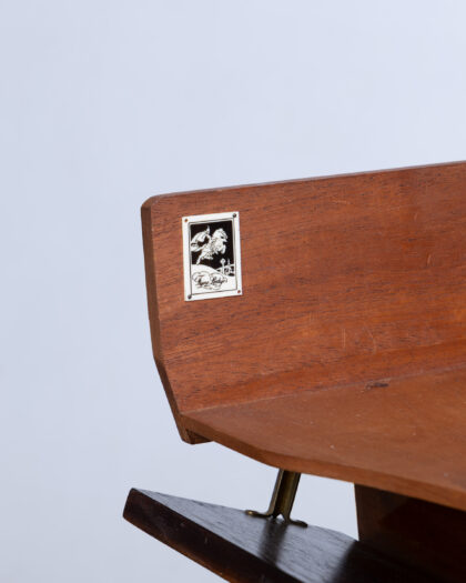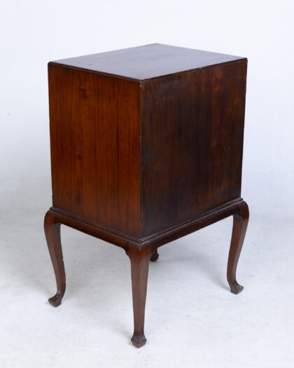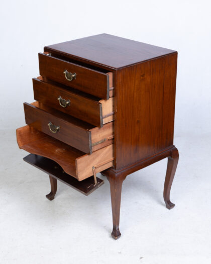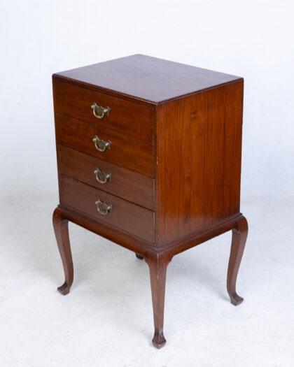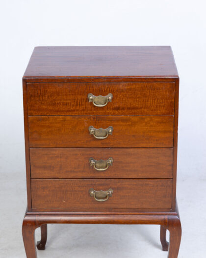 This is a vintage sheet music cabinet with a rich brown finish, likely mahogany, and classic brass hardware. The cabinet features four drawers, providing ample storage space for sheet music or other small items. The cabriole legs add a touch of elegance to the piece, reflecting a traditional design aesthetic. The overall condition appears to be well-preserved, with minor signs of wear consistent with age. The interior of the drawers appears clean and functional. There are a few surface scratches and imperfections that add to the character of the vintage piece. The design is compact and space-efficient, making it suitable for various rooms in a home. This cabinet combines functionality with a refined aesthetic, making it a great addition to any interior.