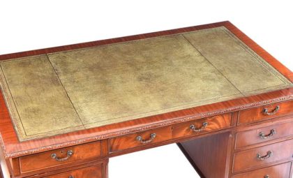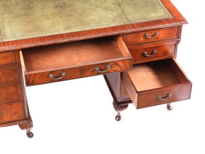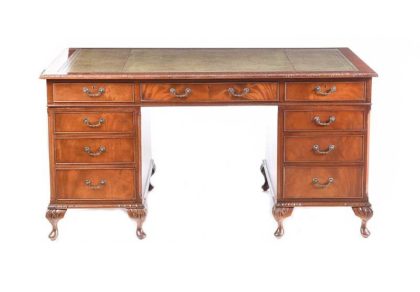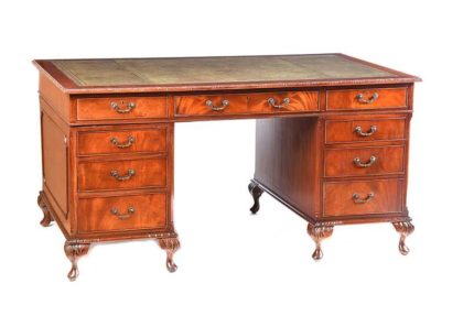 FIVE FOOT MAHOGANY DOUBLE PEDESTAL DESK FITTED WITH ONE LONG & EIGHT SHORT DRAWERS WITH TOOLED LEATHER TOP & BRASS METAL DROP HANDLES.