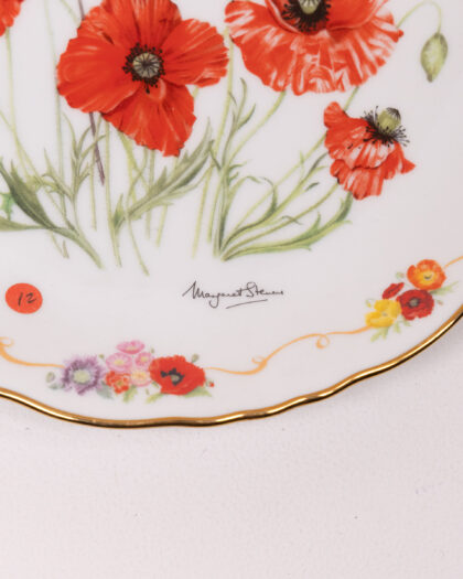 Decorative Margaret Stevens 'Field Poppy' porcelain plate from the In Flanders Fields collection. Vibrant poppy design with gold trim. Limited edition.