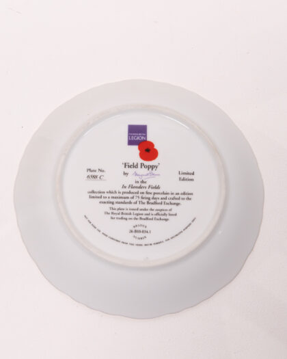 This decorative plate features a vibrant poppy design by Margaret Stevens. Produced on fine porcelain by the Bradford Exchange, this plate is a limited edition piece from the 'Field Poppy' in the Flanders Fields collection. The plate is decorated with red poppies, green foliage, and small colourful flowers around the rim, enhanced with a gold trim along the scalloped edge. The condition is excellent, with no visible chips, cracks, or crazing. A charming addition to any collection or a beautiful decorative item for any home.
