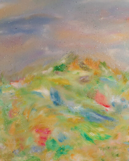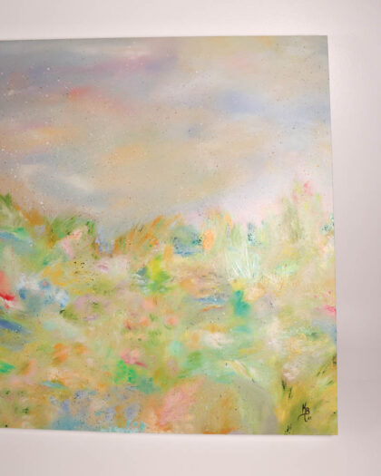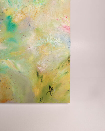 This is a brand new landscape painting by artist Kate Broderick. The painting features a vibrant landscape with fields of green and yellow, accented with touches of blue, pink, and orange. The brush strokes are loose and expressive, creating a sense of movement and energy. The canvas is stretched and ready to hang, making it easy to display in any room. The painting is signed by the artist in the bottom corner. This piece would be a wonderful addition to a living room, bedroom, or office, bringing a touch of colour and nature to the space.