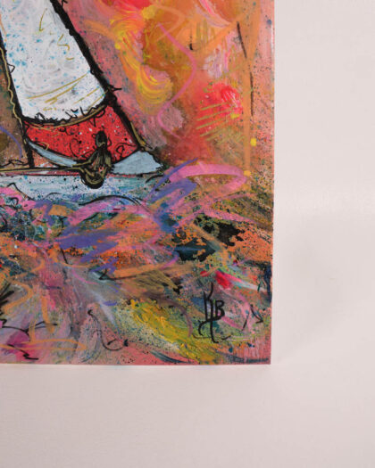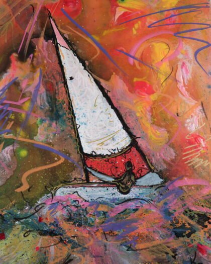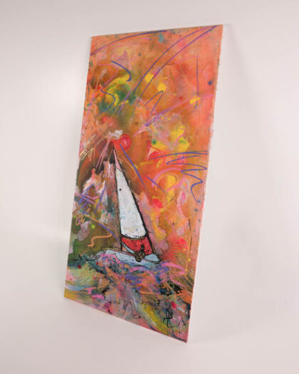 This is a brand new, original painting by artist Kate Broderick. The painting is on canvas and features an abstract depiction of a sailboat at sea. The colours are vibrant, with orange, blue, and green being the most prominent. The overall style leans toward contemporary abstract art. The painting is signed by the artist on the front, and details are written on the back. This painting would be ideal for the living room.