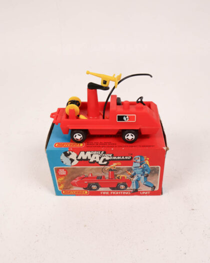 Vintage Matchbox MAC Mobile Action Command Fire Fighting Unit MC-5 in original box. Red plastic, with yellow details. Box has wear.