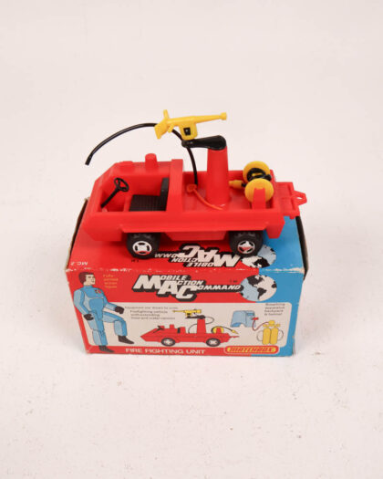 This is a vintage Matchbox MAC Mobile Action Command Fire Fighting Unit, model MC-5. It is made of red plastic with yellow accents and black wheels. The toy comes in its original box. The box shows an illustration of the toy in action. The toy itself is a small, wheeled vehicle with a fire hose and other fire-fighting equipment attached. The box has some wear and tear. The toy is in good condition overall. Perfect for kids play or display.