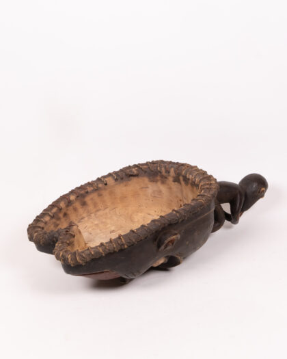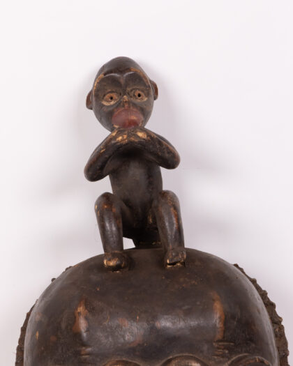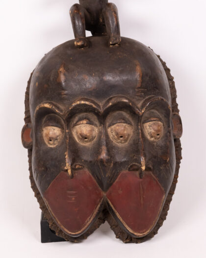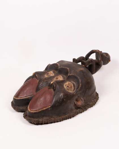 This striking African mask features a unique design with two faces and a seated figure on top. The dark brown wood is accented by the red lips and details around the eyes, adding to the mask's intriguing appearance. The mask is a tribal artefact, showcasing cultural craftsmanship and artistic expression. Overall, it remains in good condition, with minor wear consistent with age and use. It would be a great addition to any collection.