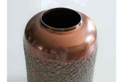 Unique textured copper-effect vase. Cylindrical shape with hammered design. Perfect for flowers or as a decorative accent. Adds rustic elegance.