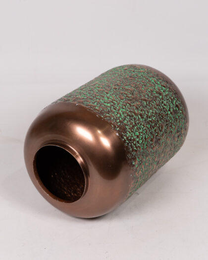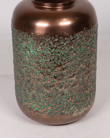 This striking copper-effect aluminium vase features a textured, hammered design that adds a touch of rustic elegance to any space. The vase has a cylindrical shape with a smooth, polished neck and base, contrasting beautifully with the rough texture of the body. The copper-effect coating has a warm, reddish-brown hue with hints of green in the textured areas, giving it a unique, aged appearance. It's perfect for displaying floral arrangements or as a standalone decorative piece. Its unique texture and warm colour make it a standout piece for any home decor.