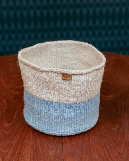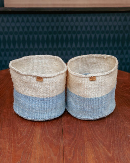 These tranquil powder blue and white colour block baskets are carefully handwoven and crafted from sustainably sourced sisal grass by artisan women in rural Kenya. Use your new woven storage basket for keeping jewellery, toiletries and stationery organized, or fill yours with fruit, dried flowers, children’s toys, remote controls, rugs, gloves and hats. These round sisal baskets make excellent desk tidies, toy baskets and woven planters for your houseplants – and perfect new home gifts. Whichever way you choose to use your new woven basket it is sure to bring a dash of texture and pastel-hued joy to your home.