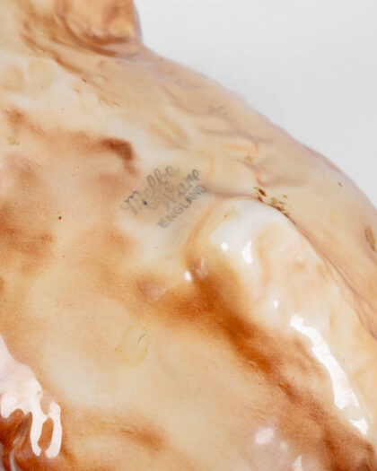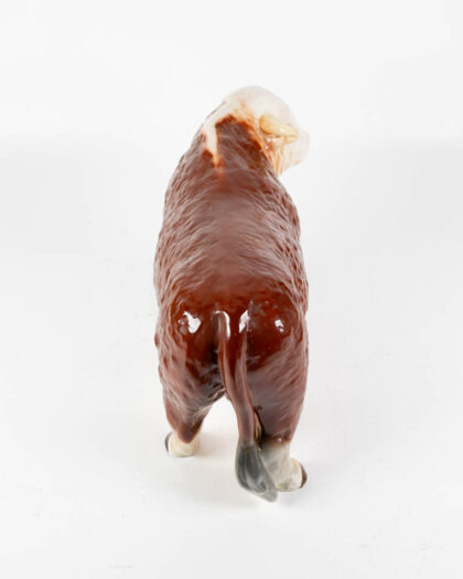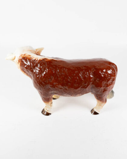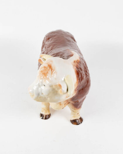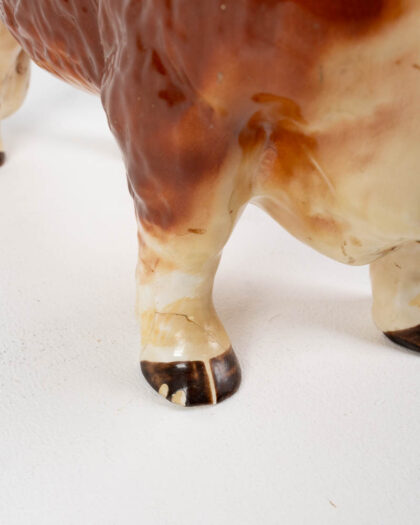 The figurine is in good vintage condition, with some visible crazing to the glaze, especially on the lighter areas. There are a couple of small chips near the base and on the horns. Overall, it presents very well. This Hereford bull figurine would make a charming addition to a shelf, desk, or mantelpiece.