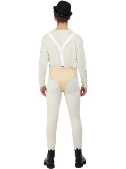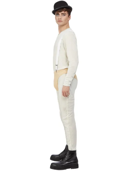 Step into the twisted world of 'A Clockwork Orange' with this iconic costume. This brand new, high-quality costume includes the signature white long-sleeved shirt and trousers, classic white braces, a codpiece and the unforgettable black bowler hat. Perfect for Halloween, fancy dress parties, or any event where you want to make a bold statement. Please note: Washing Instructions - Dry Clean Only. Complete the look with your own pair of black boots and cane.
