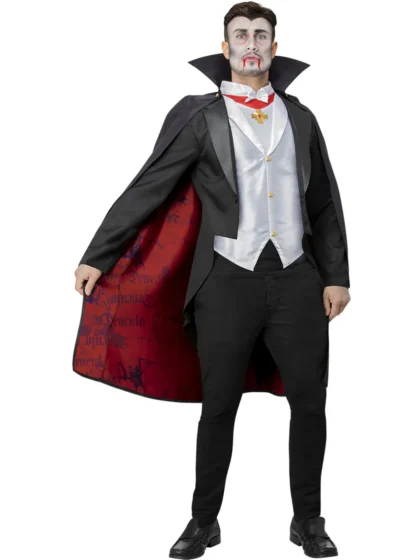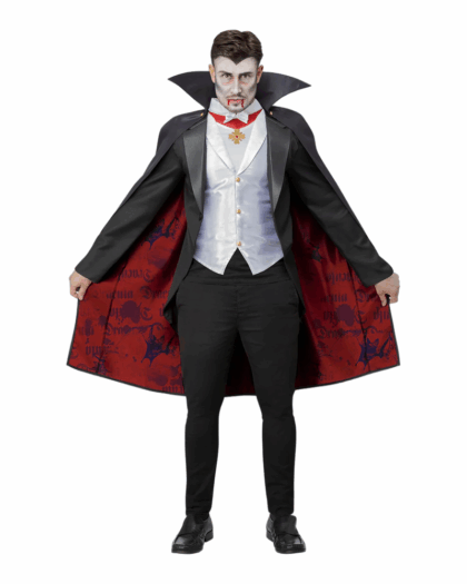 New Universal Monsters Dracula costume, includes jacket with mock waistcoat, top, cape & medallion. Ideal for Halloween or dress-up!
