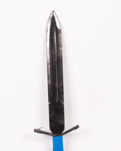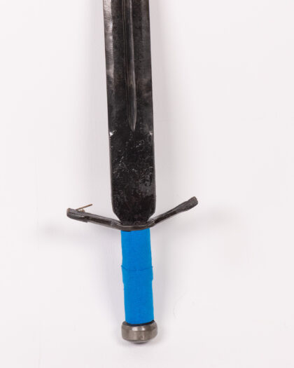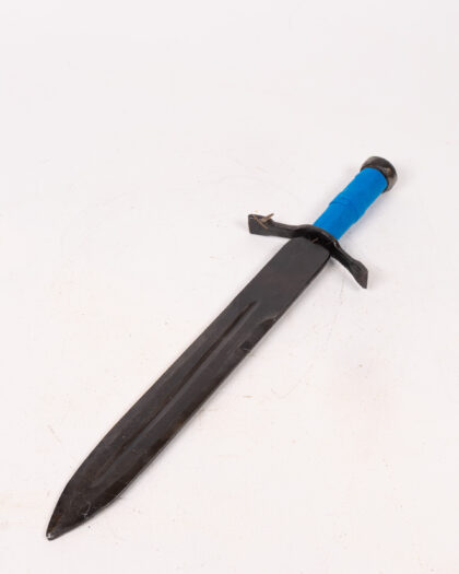 Decorative metal sword with a blue fabric wrapped handle. A unique piece for display. In good condition.
