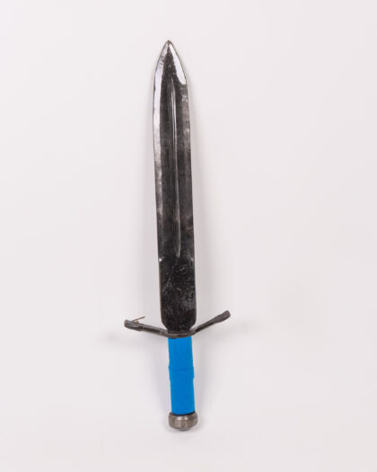 This is a decorative metal sword, featuring a blade with a dark, slightly pitted surface, giving it a textured and worn appearance. The hilt has a cross guard. The handle is wrapped in a bright blue fabric, providing a striking contrast to the darker metal. The overall style suggests a medieval or fantasy theme. It would make a great decorative piece. In good condition.