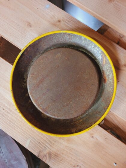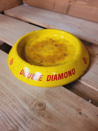 A yellow circular metal ashtray. Bears red lettering which reads, "Double Diamond".