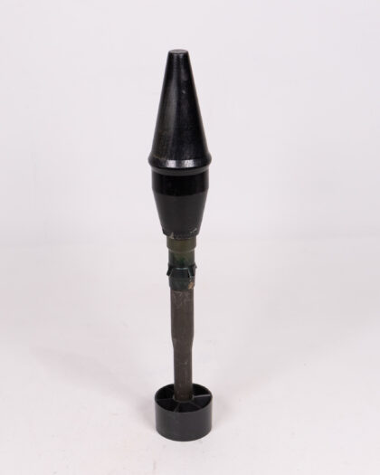 Vintage practice mortar round. Olive green cylindrical body with a black, conical warhead. Metal construction with some signs of wear and age, including minor scratches and discoloration. A collectible military item for display.