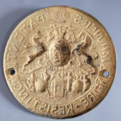 A metal plaque from the front of a safe; reads, "Milner's Patent Thief-resisting".