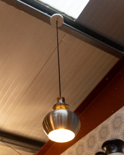 A beautiful hanging lamp, model “carthago”, manufactured by raak in the netherlands around 1970. This elegant piece is made of high quality aluminium with brown glass.