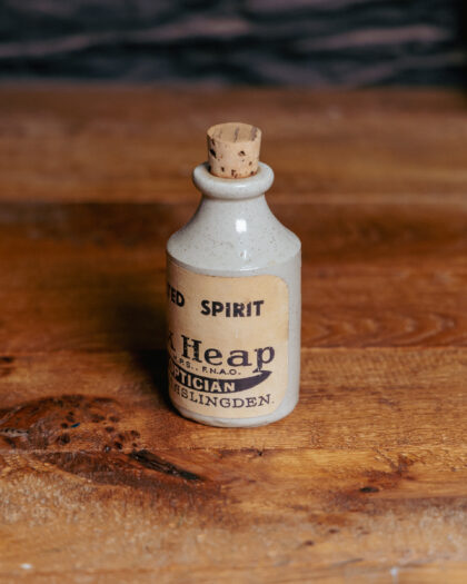 A small stoneware bottle with applied label reading, "Methylated Spirit Frank Heap Chemist & Optician Haslingden".
