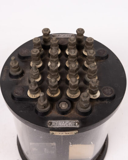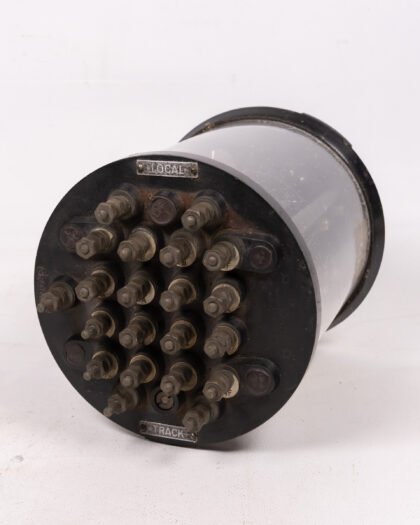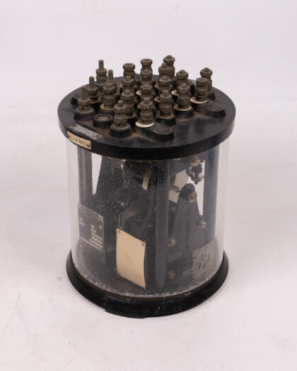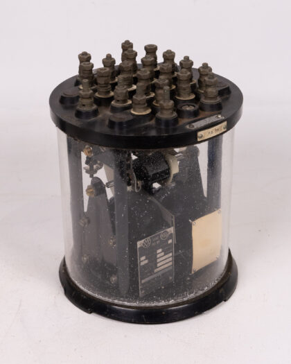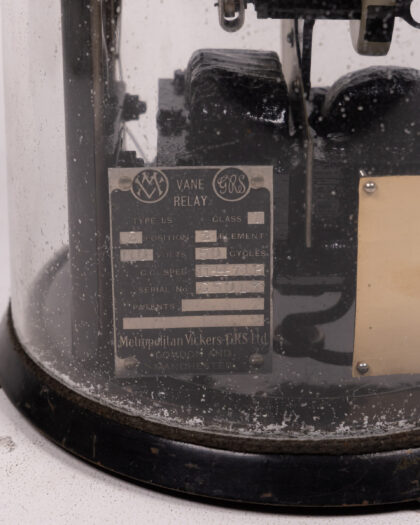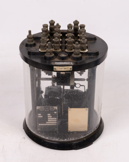 Vintage Metropolitan Vickers Vane Railway Relay in cylindrical display case. Features labeled terminals and interior components. Great for a vintage electrical collection.