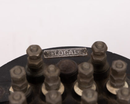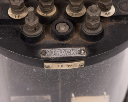 A vintage Metropolitan Vickers Vane Railway Relay, Type LS, housed in a clear cylindrical casing, with a black base and top. The top of the unit features numerous bolts and terminals, labelled. The interior components are visible through the clear casing, including nameplates with specifications and manufacturing information. The unit is marked 'Track P.B. 119'. The item has surface wear and imperfections consistent with age and use.