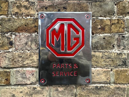 Brand new aluminium MG sign featuring the iconic octagonal logo in bold red, plus 'Parts & Service'. Ready to mount, perfect for British car enthusiasts.