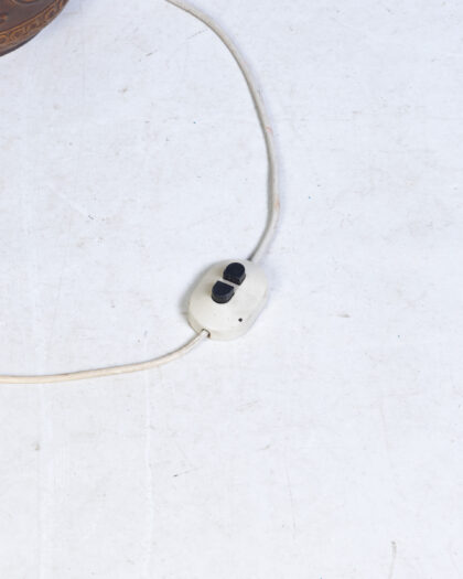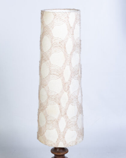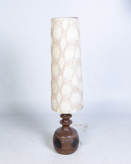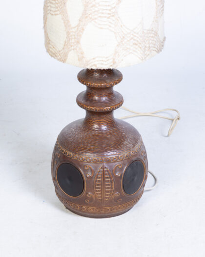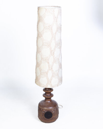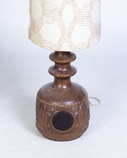 This is a vintage mid-century table lamp with a brown ceramic base and a tall cream shade. The base features a textured, patterned design with circular cut-outs. The shade is a tall cylinder with a woven or textured pattern. The lamp is in good vintage condition, with some minor wear consistent with age. It is a great addition to any mid-century modern decor.