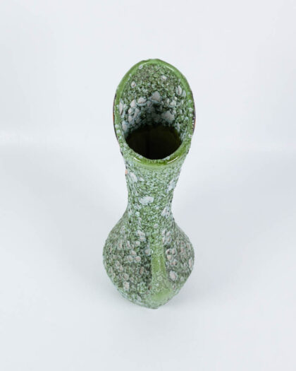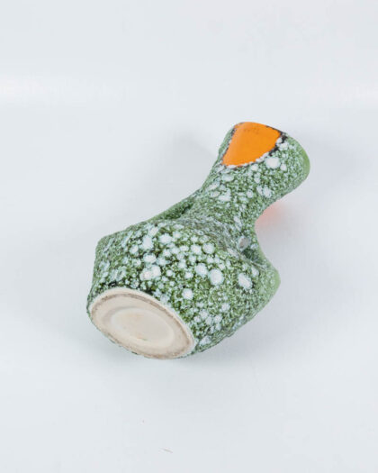 This is a mid-century ceramic vase featuring a distinctive shape and a mottled green finish with white spots. It has an unusual form with an orange accent near the top and a handle like opening. The vase has an organic, almost asymmetrical design, typical of the era. The base is unglazed ceramic. This vase would add a touch of mid-century style to a shelf or mantelpiece. The glaze has cracks and chips in places and a large amount of the glaze is missing revealing the ceramic underneath.