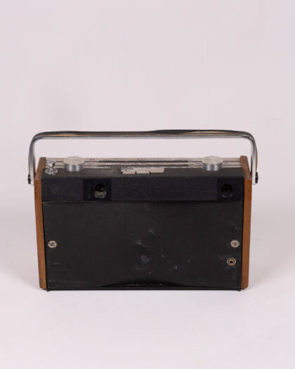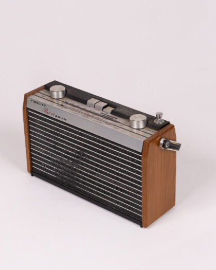 Vintage Fidelity Rad 19 AM-FM radio with a brown wood finish. Silver faceplate with black accents. Untested. Good condition for age.