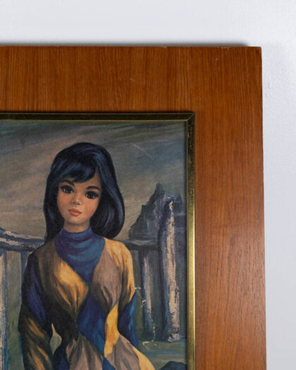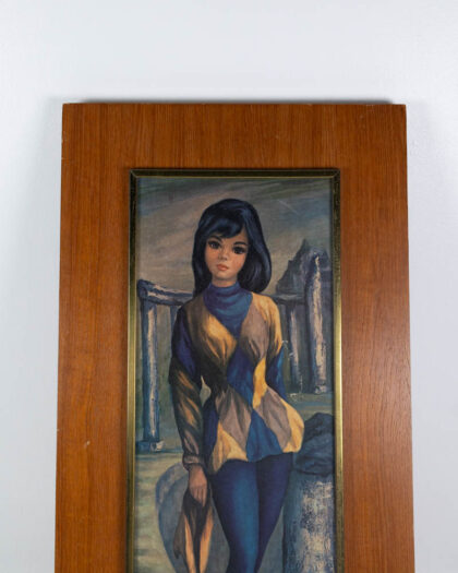 This framed print is in a Mid Century modern style. The print depicts a young girl dressed in a harlequin-inspired outfit in shades of blue and yellow. The background suggests a classical setting with pillars. The print is framed with a narrow brass trim, within a larger wooden frame. Some wear is visible on the frame, commensurate with age. This framed print would be a stylish addition to a Mid Century-themed living space.