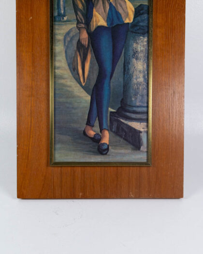 Mid Century modern print of a girl in harlequin style clothing, framed in wood with a brass trim. Wear consistent with age.