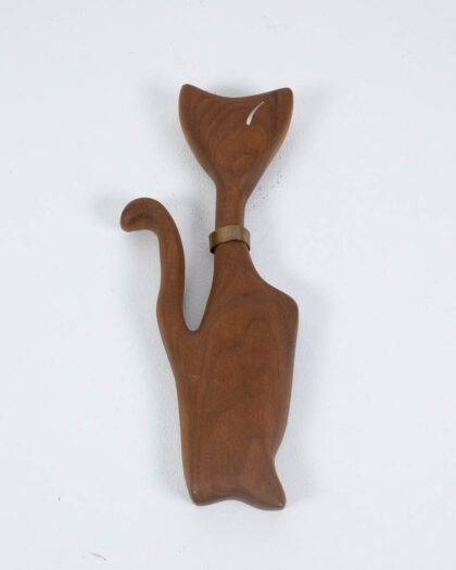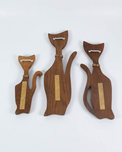 This is a set of three mid-century modern carved wooden cat figures. The figures are stylised with a long neck, triangular head with ears, and a metal ring around the neck like a collar. Each cat has a small, white accent on its face indicating the eye. Each one is a slightly different size. They are mounted on the back with hooks to hang on the wall. They have a warm patina from age and use and are in good condition. These would display well in a mid-century modern styled living room or home office.