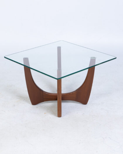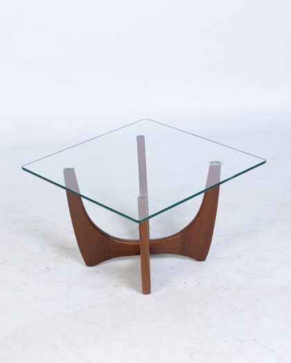 Discover this elegant Mid-Century Modern coffee table, a timeless piece featuring a striking square glass top paired with a sturdy solid wood frame. The base showcases a distinctive natural wood finish with sleek, curved supports that gracefully cross in the centre, creating a captivating focal point for any room. Its versatile design makes it an ideal addition to a living room or lounge setting, perfect for displaying decor, holding beverages, or simply enhancing your space. The glass top is free from visible chips or cracks, and the wooden frame remains exceptionally sturdy, promising durability and enduring style.