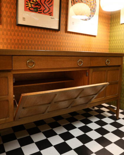 This Mid-Century Modern credenza showcases the clean lines and functional design characteristic of the era. Crafted from teak, the credenza features a long, low profile with a combination of cabinet space and drawers. The cabinet doors feature a geometric panel design and open to reveal ample storage space with shelves. The drawers are adorned with circular brass pulls, adding a touch of elegance. The wood has a warm brown tone and has developed a rich patina from age and use. The credenza is in good condition, with some signs of wear consistent with its age. This credenza would make a stylish addition to a living room, dining room, or home office, providing both storage and a touch of mid-century flair.