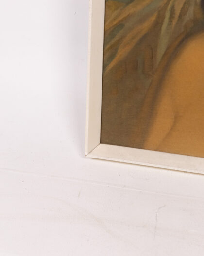 This is a mid-century framed print titled 'Nina', signed by Van der Sude. The print features a portrait of a woman with dark hair and hoop earrings, set against a background of tropical foliage. The frame is painted white and has a simple, flat profile. The print is in good vintage condition. The colours are still vibrant, and the print is free from major damage. There may be some minor signs of age or wear, such as light fading or small imperfections in the frame, as expected with an item of this age. This print would be a great addition to any mid-century modern decor.