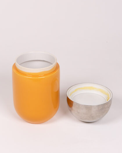 Mid Century Typhoon 'Capsule' Storage Jar. Quirky design with orange body and silver lid, good condition! Retro storage.