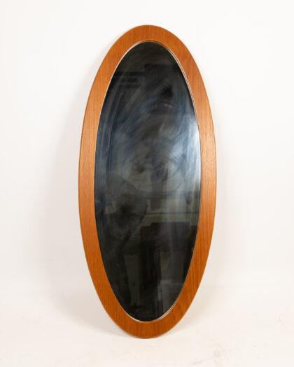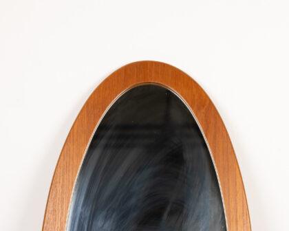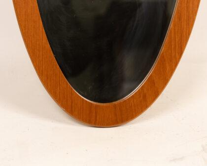 Elegant mid century oval wall mirror with a wooden frame. Perfect for adding a vintage touch to any room.