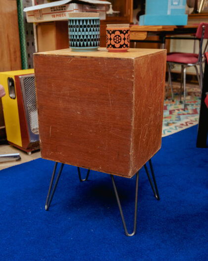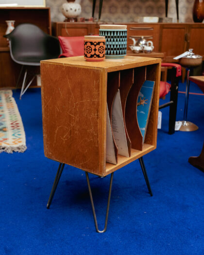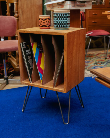 A Mid Century, teak filing cabinet which has been mounted on hairpin legs and repurposed as a side table with storage for vinyl records. A beautiful piece made here in the On The Square Workshop!