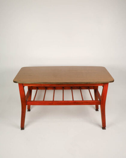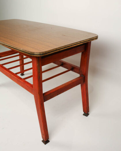 Mid-century modern coffee table with red painted wood frame and laminate top. Features lower shelf and square tapered legs. Good condition.