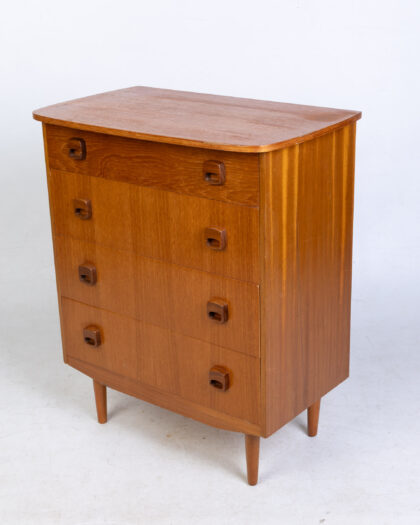 Vintage Mid-Century teak chest with four drawers, sleek design, ideal for bedroom or living room storage.