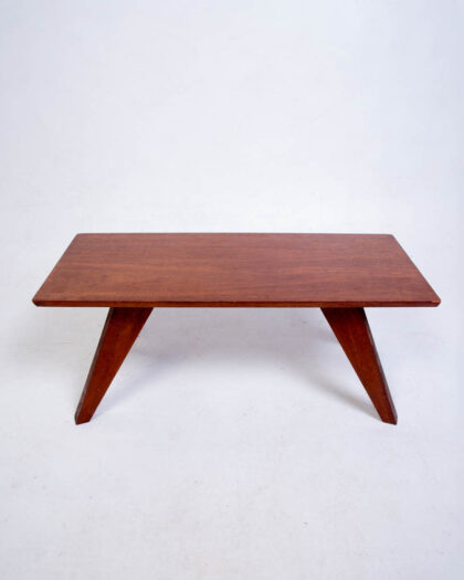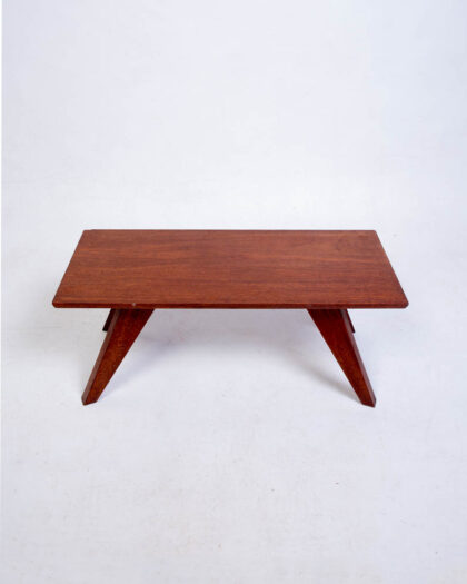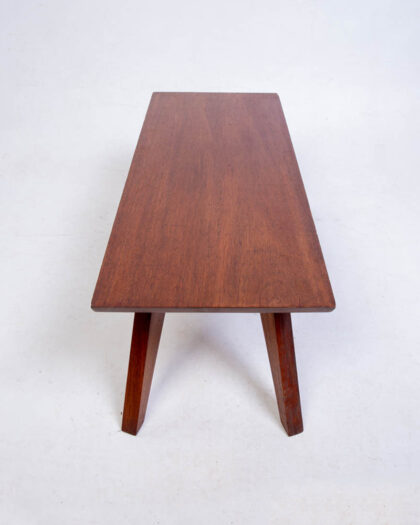 This is a mid-century modern coffee table, circa 1960s. It features a clean and simple design with a rectangular top and tapered legs. The table is made of teak wood, which has a warm brown tone. The tapered legs are connected to the tabletop with cross braces. The design is reminiscent of Scandinavian modern furniture. The table is in good condition, with some age-related wear, including some light scratches to the top surface. The table is sturdy and ready for use and would make a useful addition to any living room or lounge space.