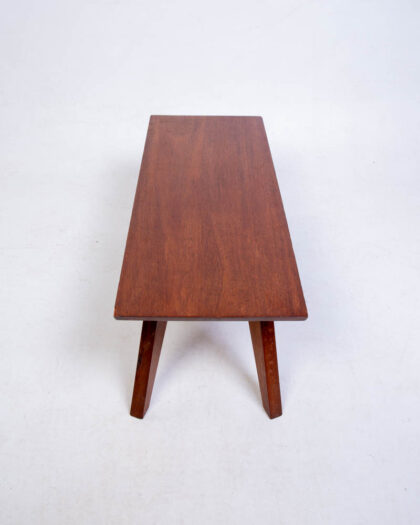 Mid-Century Modern coffee table featuring tapered legs and a rectangular top. Teak wood with a warm brown tone. Good condition with age-related wear.