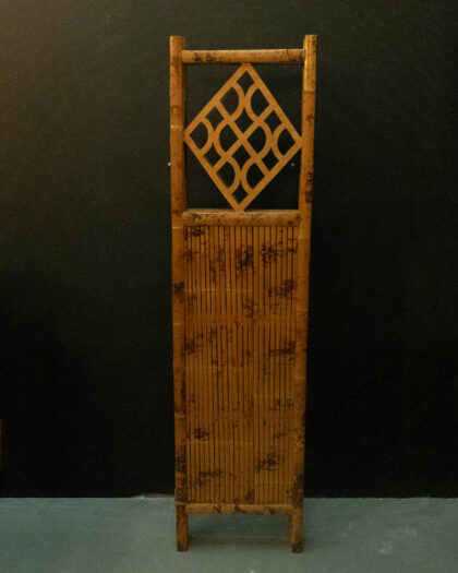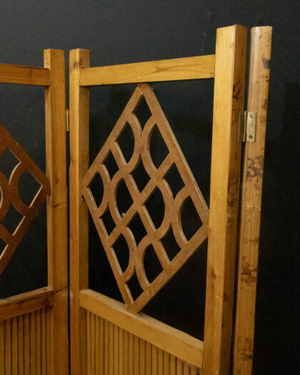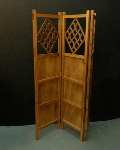 Wooden 3-panel room divider with diamond geometric cutouts. Hinged for folding. Light brown wood. Good condition.