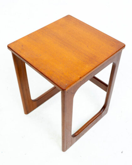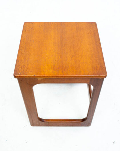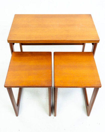 The teak wood has a warm brown hue and visible grain. The tables are in good condition with some age-related wear and slight surface marks. These nesting tables are a practical and stylish set for a living room or lounge.