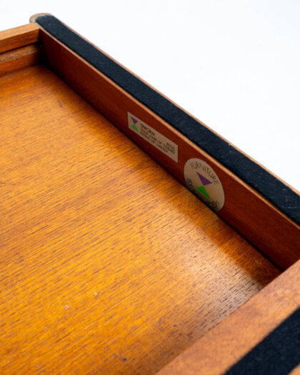 This is a set of three mid-century nesting tables crafted from teak wood. The tables are designed to nest within each other for compact storage, making them a versatile addition to any living space. The largest table features a hinged top that opens to reveal a small compartment with felt lining. Each table features a distinctive leg design with curved cutouts, characteristic of retro furniture from the era.