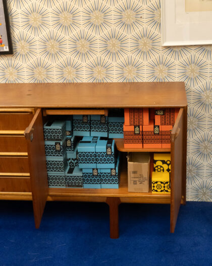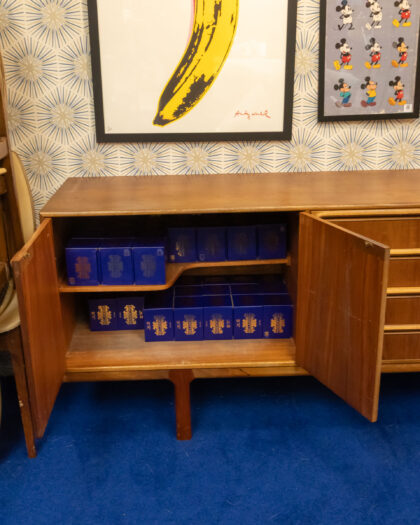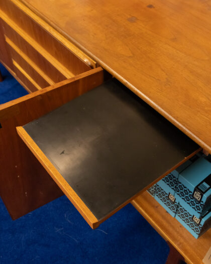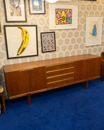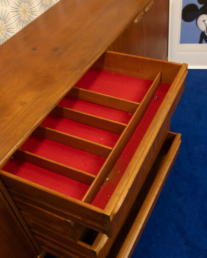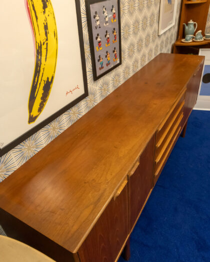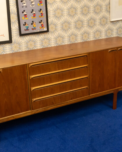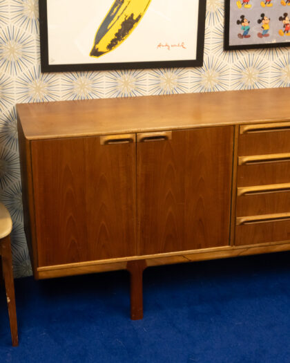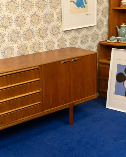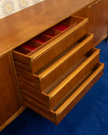 This stylish mid-century sideboard features a beautiful teak wood construction. It offers ample storage with both doors and drawers, combining functionality with a sleek design. Perfect for a living room, dining room, or hallway, this sideboard adds a touch of vintage charm to any space. The interior of the drawers are lined with red felt. The furniture shows age-related wear and tear and some marks.
