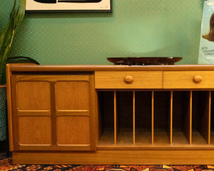 This is a classic Mid-Century sideboard in teak. It has a clean, streamlined design typical of the era. The sideboard features two outer cupboards, each with an internal shelf, two central drawers, and an open central storage section with slatted dividers for vinyl records. The drawers have recessed circular handles.